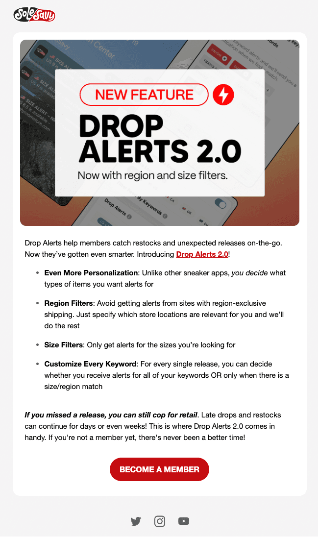 One of my key accomplishments in this role was developing a comprehensive content strategy that helped to establish DROPS as an industry-leading tool to receive instant alerts on the latest sneaker drops and restocks. I worked hand-in-hand with the product and brand team to highlight features and implement user updates and did all copywriting and messaging for any consumer-facing content.